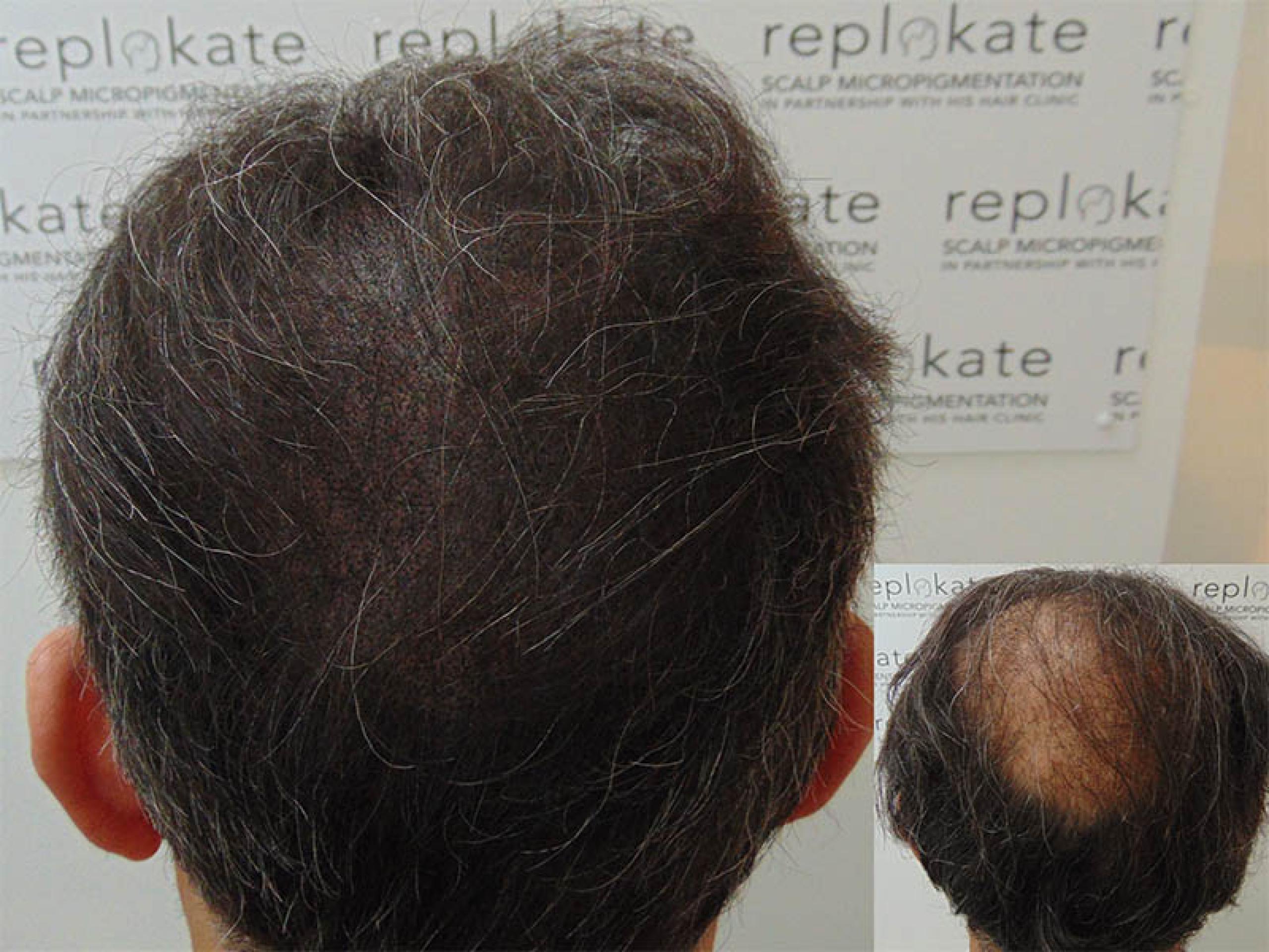Crown balding can start at any age but for most men it starts in their mid 20’s following along side this a receding hair line, at either a slow or fast rate. As the crown losses more density over time the balance between the crown and hair on the back of the head becomes stronger. When considering the SMP treatment for this condition we strongly advise cutting down the thickness or length of a client hair this helps the connection and visual appearance of the two areas overall.